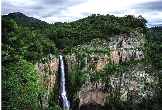 千丈岩瀑布是我国东南地区的名瀑之一,唐宋以来一直是浙东四明的一处重要游观地。瀑流之源为雪窦寺左右两道涧水,双流汇聚于寺前的锦镜池,又穿越关山桥,夺崖顶之口,奔泻喷薄,落差高达186米。中壁有巨石突兀,瀑流击石而散,是故瀑布呈上下两段。上段势如天河决口,蛟龙入海;下段状若银丝倒挂,飞雪四溅。远眺近观,气象万千,尉为壮观。历代文人雅士对千丈岩吟咏不休。王安石知鄞县时,曾游千丈岩,他在崖顶飞雪亭赏瀑,赋诗曰:“拔地万重青嶂立,悬空千丈素流分。共看玉女机丝挂,映日还成五色文。”其后,读了王诗的曾巩也慕名前来。曾巩觉得崖顶赏瀑仍不够畅快,特绕下山去瀑底览赏,道出了迥然不同的感受:“玉虬垂处雪花翻,四序雷声六月寒。凭槛未穷千丈势,请从岩下举头看。”