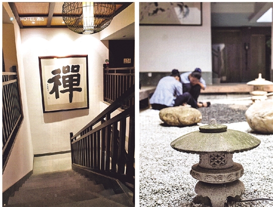 酒店右边是京杭大运河杭州段的码头,古时北方客人来南方礼佛的第一站,乾隆多次下江南的码头也是在这里。随着大运河申遗成功,这片区域被打造成大兜河文化区,越来越多杭州本地特色的生活小店入驻。香积隐域客栈隐于闹市,从门外看烟火气十足,但进门后却是自成一派的风景。房间是简单朴素的仿明代家具,少不了的茶和榻榻米,打开房间窗户,外面是成片的白墙黑瓦,木窗花格彼此相连,虽然建筑都是仿古的,但划过天空的群鸟让一切多了古韵。出世入世,只在闲庭信步间。