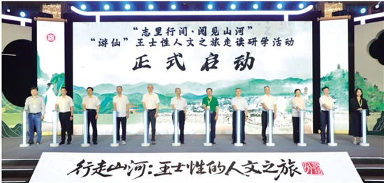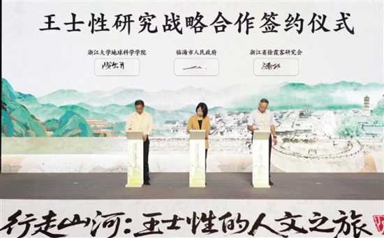▲浙江大学地球科学学院书记钱智敢、临海市政府副市长王啸啸、浙江省徐霞客研究会会长潘俊国(左至右)参加签约仪式